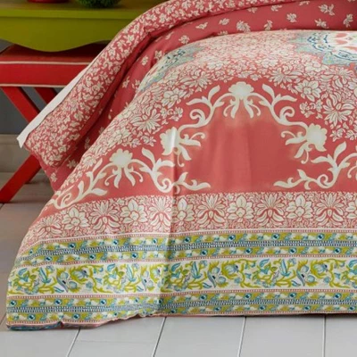 Surround yourself in an exotic garden with the Amrita Medallion comforter set. Vibrant corals and blues create intricate over scaled floral medallions that are bordered by luscious vines. The delicately embroidered medallions on the shams add a rich textural dimension. Made of 100% cotton with polyester fill. Set includes comforter and 2 shams.