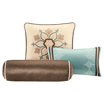 For the more traditional bedroom, spruce up your décor with a pop of color in the Camila Comforter Set. Made from polyester quilted charmeuse, this decorative collection features beautiful color accents. Includes three decorative pillows which play up embroidered details for a finished look. Two euro shams give a dramatic backdrop to this striking collection.