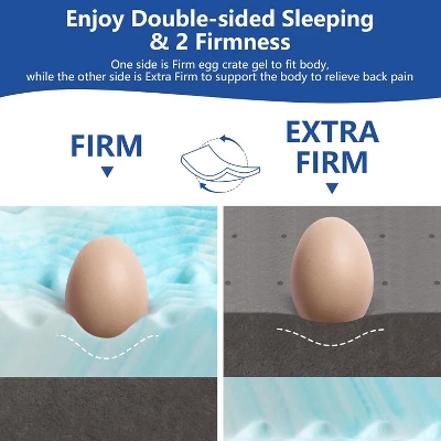 - 1. UPGRADED FIRM MATTRESS TOPPER WITH ICE SILK COVER Designed with a 2-layer cooling system (premier cooling egg crate gel + bamboo support foam), this CertiPUR-certified topper offers reversible firmness (Firm & Extra Firm) for optimal spinal support to target back pain. The odor-free design and anti-slip adjustable elastic straps ensure stability and luxury, making it a perfect family gift.