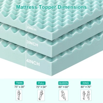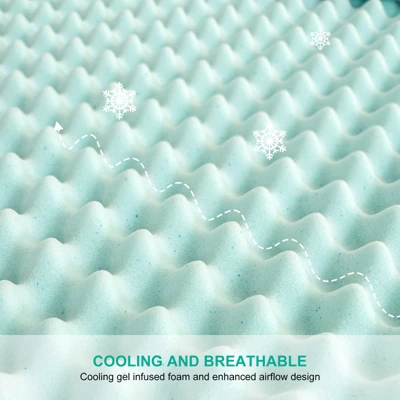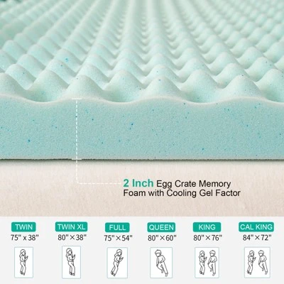 【CertiPUR US Certified Memory Foam】Experience the perfect blend of softness and support with our exclusive high-density memory foam, designed to contour to your body¡¯s curves. This premium material alleviates pressure, promotes easy breathing, reduces muscle soreness, and ensures a restorative deep sleep.【Egg Crate Design for Enhanced Comfort】Our unique egg crate foam design maximizes airflow between your body and the mattress, providing exceptional cushioning. This feature enhances comfort on any sleeping surface while helping to maintain proper spinal alignment and relieve pressure points for a better night¡¯s sleep.【Cooling Gel-Infused Technology】Enjoy a cool and comfortable sleep with our mattress topper, infused with breathable gel particles. This innovative design helps dissipate heat and regulate body temperature, preventing overheating and ensuring a comfortable sleep environment throughout the night.【Versatile Usage】Available in various thicknesses and sizes, our mattress topper is perfect for enhancing comfort on mattresses, sofa beds, and RV beds. Tailor your sleep experience to meet your individual preferences and needs.【Hassle-Free Setup】Our memory foam mattress topper arrives compressed for easy shipping. Simply unpack and place it in a well-ventilated area for 29 hours to allow it to fully expand. Tip: To prevent discoloration, avoid placing the foam in direct sunlight during the expansion process.