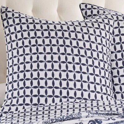 The Valentina euro shams are the perfect complement to the Homthreads Valentina collection. This is the perfect accessory to add a layer of dimension and truly complete your bedroom. Sized at 26x26in., the euro shams features a square lattice pattern printed in navy on a white ground. Made from 100% polyester, the Valentina euro shams are easy to care for. They come as a set of 2 without a filler.