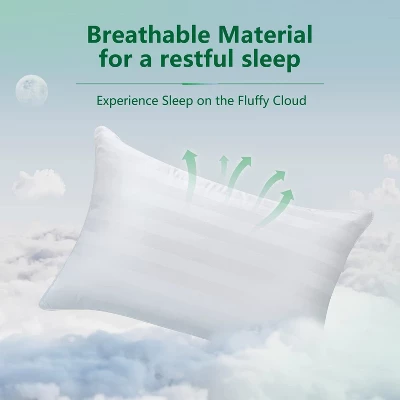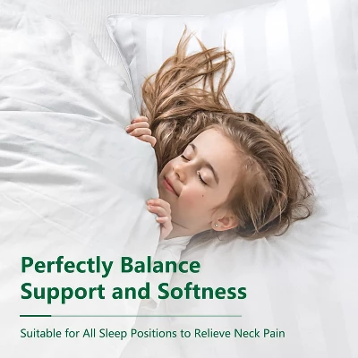 The FAPO Bed Pillows Queen Size 2 Pack features soft down alternative microfiber pillows for sleeping. The pillows are filled with premium polyester blend fiber for comfort and support , and the cover is made of 100% peach skin shell for breathability. The pillowcase is made of organic cotton sateen polyester with a high thread count, providing a soft and smooth surface. The pillow is designed to maintain the natural curve of the neck and head , reducing pressure and alleviating shoulder stiffness. It is machine washable and hypoallergenic , making it suitable for adults and children with sensitive skin. The queen-sized pillows come in a pack of two and are available in white color.