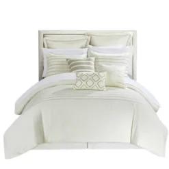 Invigorate your space with the striking modern look of the Garner 7 Piece Jacquard Comforter Set. The jacquard woven comforter flaunts a sequin design that adds a stunning contemporary accent to the top of the bed, while a solid reverse provides a rich touch of color. Matching shams echo the look of the comforter, spreading the dazzling allure to the head of the bed. Three decorative pillows with embroidered details and a solid bed skirt complete the bedding set by providing the perfect finishing touches. Machine washable, this jacquard comforter set brings a bit of glitz and glam to update your bedroom decor.