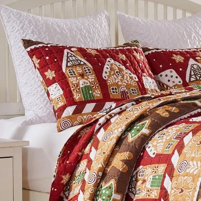 Transform your bedroom into a festive wonderland with our Gingerbread Lane Quilted pillow sham. Featuring rows of gingerbread houses, dancing gingerbread men, frosted Christmas trees, and whimsical icing-covered snowflake cookies, ruby red hearts, and peppermint candies, this decorative pillow cover creates a dreamy holiday atmosphere. Each sham reverses to a coordinate Christmas scene print. It’s perfect for adding a touch of holiday magic to your home.