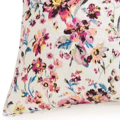 This romantic floral pillow sham from Vera Bradley will brighten up your bedroom or guest room. Roses mixed with wildflowers cascade across a cream ground. These colorful flowers have been created with an ikat effect to add a modern pop. The reverse is a coordinating floral ditsy on a cream ground. The vermicelli quilting pattern completes the look of this lovely sham. Matching quilt is sold separately. Machine wash in cold water, gentle cycle. Do not use bleach. Tumble dry low. Use cool iron as needed.