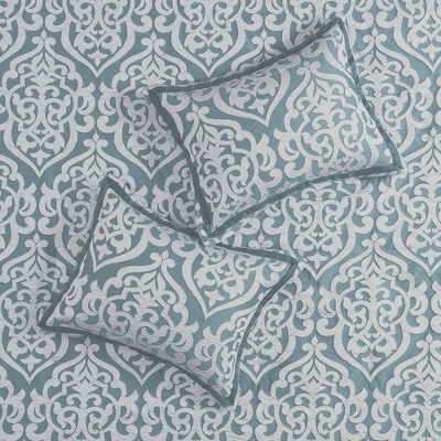 Add a touch of class to your bedroom with the Eilot 8 Piece Jacquard Comforter Set. The luxurious textured jacquard comforter and shams flaunt a gorgeous damask medallion design with silver striations on the satin ground that add dimension to the lavish look. A solid aqua reverse and stunning euro shams complement the top of the bed to complete the ensemble. Also included are two decorative pillows that feature embroidery and cording details, while a solid aqua bed skirt provides a clean and elegant finish. Overfilled for superior warmth and comfort, this jacquard comforter set offers a strikingly luxurious update to your decor. Items in the set may come in a rolled or compressed packaging, which will need to be fluffed up or steam ironed before use to remove wrinkles.
