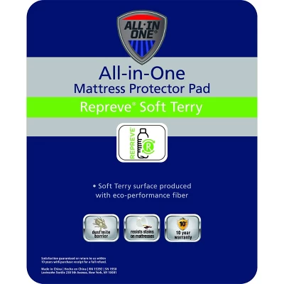 Make a difference with the All-In-One Repreve Recycled Collection. All products are produced with environmentally friendly fabric made from recycled plastic bottles. Billions of plastic bottles are put into landfills year after year. Sleep well knowing you are buying products made with REPREVE recycled fabric. In addition to reducing your carbon footprint, you will also sleep better because All-In-One provides maximum protection for your mattress and pillows against dust mites, pet dander and other unwanted allergens. We use strong, safe, and soft fabric, without sacrificing breathability and comfort. All products are water-resistant, stain-resistant, and hypoallergenic to keep your family sleeping safe. Fitted mattress pads feature stretch sidewalls fitting mattresses up to 15 inches deep. We are so confident in the quality and durability of our products, that each purchase includes a 10-year warranty! Our eco-conscious products are also easy-care machine washable.