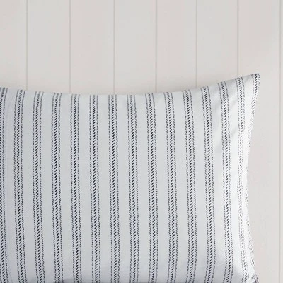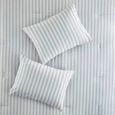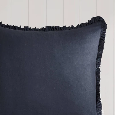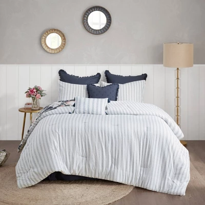 The Sorrel Cotton Printed Reversible Comforter Set includes everything you need to transform your sleeping space into a serene retreat. The comforter is accented with large, expansive florals on a navy background, and it reverses to a striped pattern on a white background for versatile styling. The included pillow shams and decorative pillows feature a mix of solids, prints and embroidery along with ruffled trim or tasseled accents, while the navy bedskirt provides the perfect finishing touch.