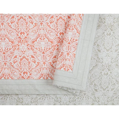 Rejuvenate your bedroom style with the Jessica Simpson Coral Gables Comforter set. The comforter features a painterly damask print on 100% cotton. The face features the damask a lively coral and the reverse is the same damask print in dusty gray. Coordinating decorative pillows sold separately. This comforter set is machine washable.
