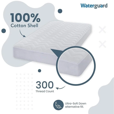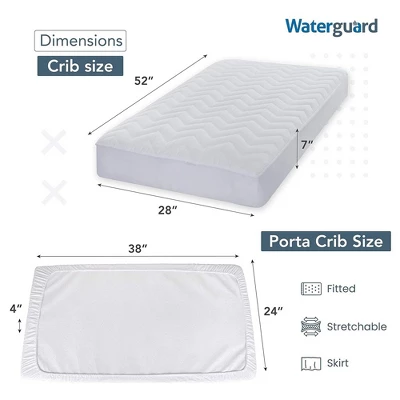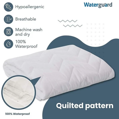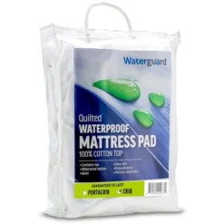 Protect your mattress from water and other spills with the Waterguard Mattress Pad. This premium bed protector is made of 100% high quality cotton top, microfiber bottom, polyester and premium polyurethane waterproof fabric. Its outstanding stretchable properties allow it to fit mattresses up to 15″. No more buying a new mattress because of a single spill. Simply wipe off or wash this great cover sheet with bleach and let it dry in direct sunlight if needed.