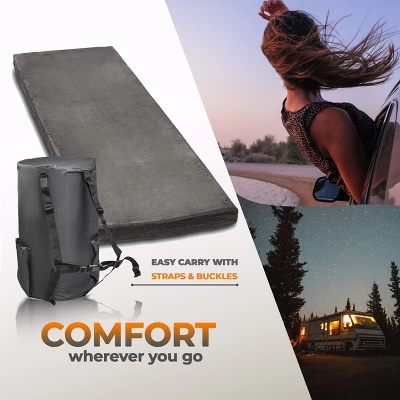 Carry your bed on your back! Whether you’re traversing a mountain, performing Pilates, hosting a sleepover, or traveling cross country in the camper, never roll the dice when it comes to a good night’s sleep! With this ultra-comfortable Roll-Up Memory Foam Mattress from Zermätte, a restful overnight experience is 100% guaranteed. Our sleep specialists designed this folding mattress pad with versatility in mind, providing users with a dream blend of firm poly padding, moldable memory foam, and plush comfort you have to feel to believe. Place it on the ground for an instant outdoor sleep space; carry it to yoga class for cozy on-floor support; or roll it out in a guest room for luxe accommodations without breaking the bank. With a cool carry bag, easy-wash cover, bonus eye mask, and free ear plugs—we’ve got you covered! Add a Zermätte Roll-Up Memory Foam Mattress to your cart today!